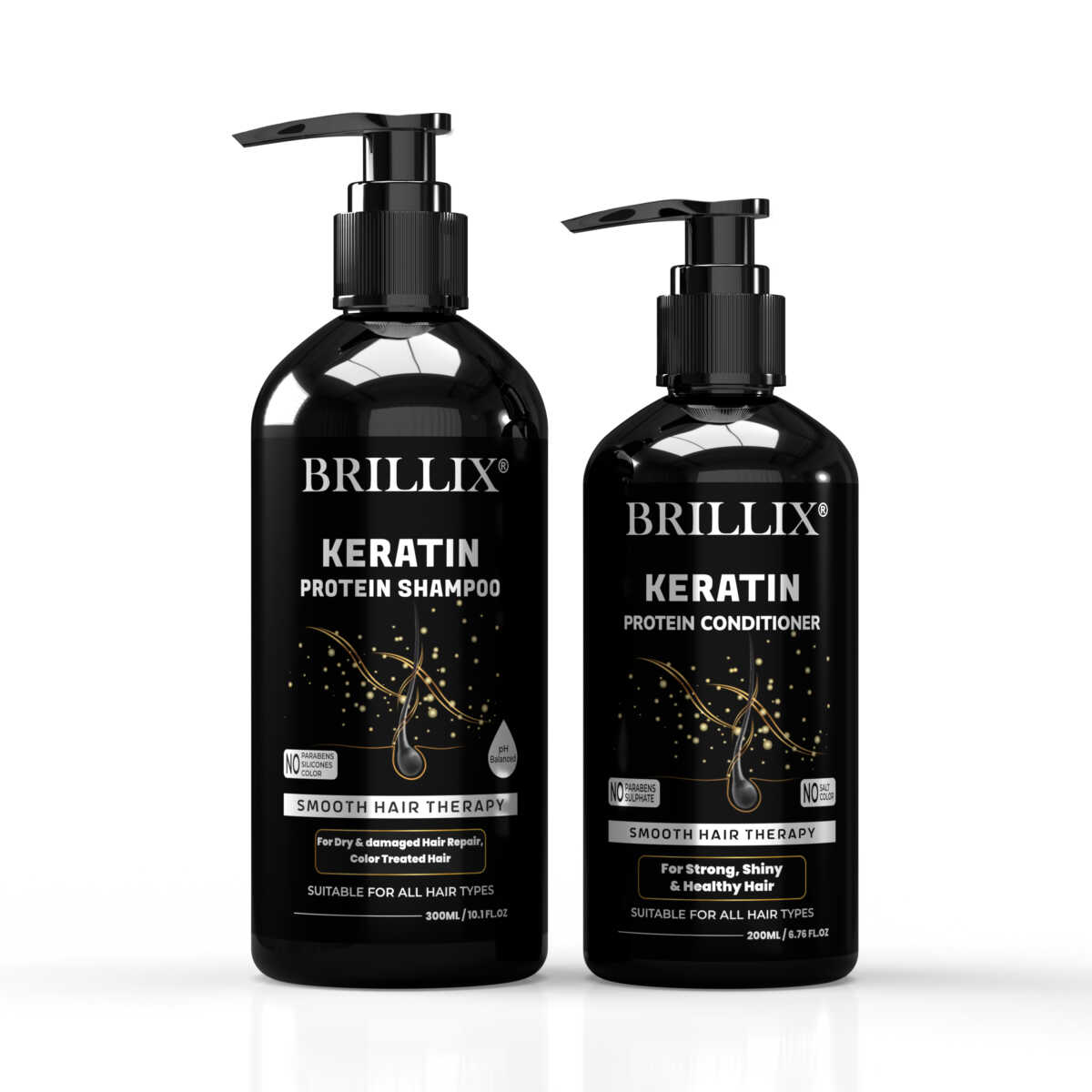 - Contents: BRILLIX Keratin Protein Shampoo 300 ml, Conditioner 200 ml