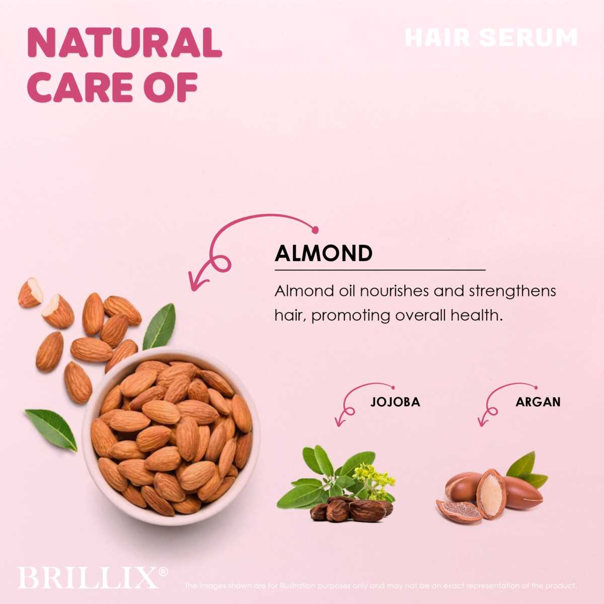 - BRILLIX Hair Serum, formulated with natural ingredients like Almond Oil, Jojoba Oil, Argan Oil, and Vitamin E, helps to make your hair Healthy, bouncy, Shiny, frizz-free, and easier to manage. It also protects your hair from damage.