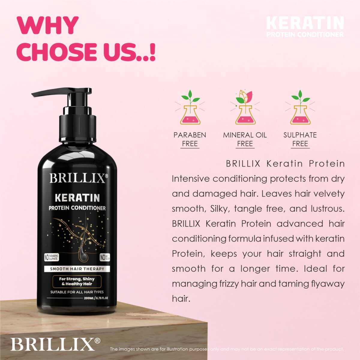 - BRILLIX Conditioner, formulated with natural ingredients like KERATIN PROTEIN, helps to make your hair Shiny, softer, smoother, and easier to manage.